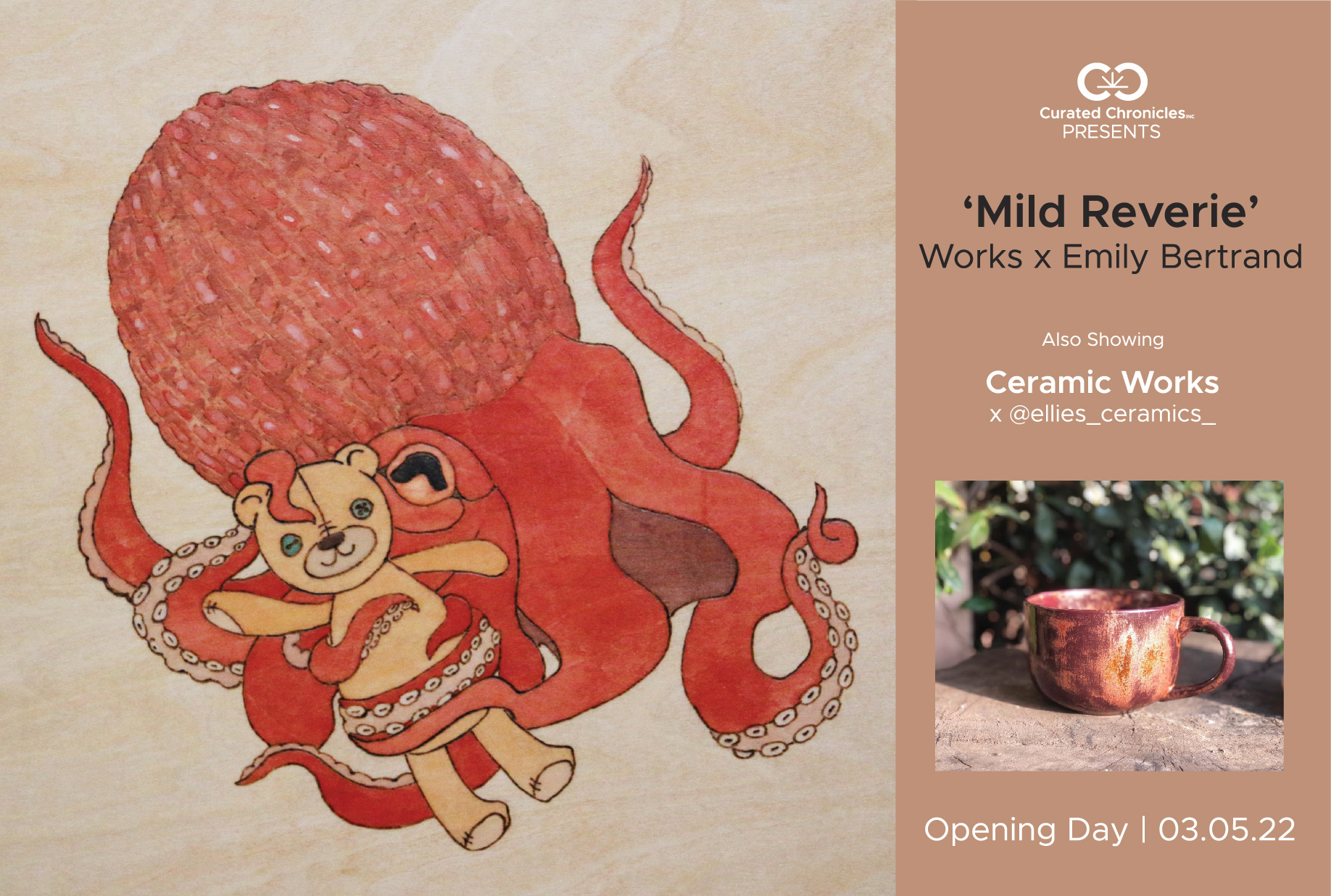 Mixed media works by Emily Bertrand with a focus on wood burnings of whimsical illustrations on wood panels.